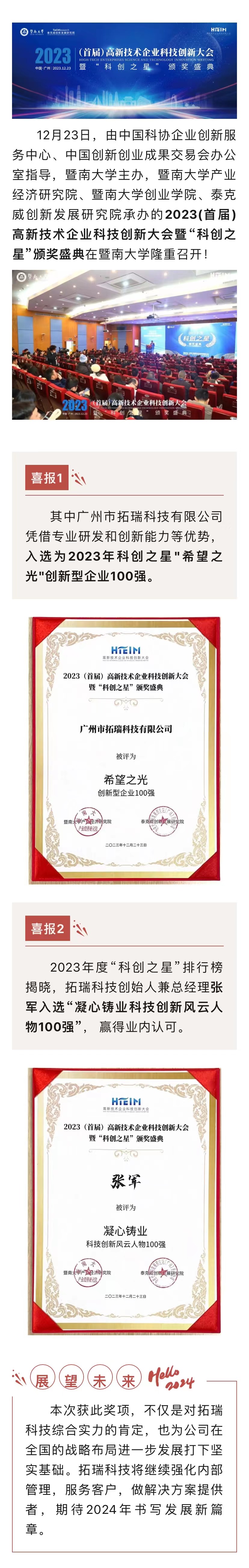 喜報|拓瑞科技榮獲2023年科創(chuàng)之星"希望之光"創(chuàng)新型企業(yè)100強